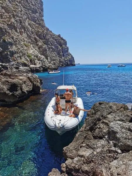 Tour in gommone con partenza alle 10:00. Visiterete suggestive calette come Cala Rossa e Cala Azzurra con diverse soste bagno e snorkeling. Esplorerete il paesino di Favignana per un'oretta e mezza e vi verrà offerta un pranzo al sacco dallo staff. In seguito navigherete verso Levanzo prima di ritornare a Trapani verso le 17:30 / 18:00.