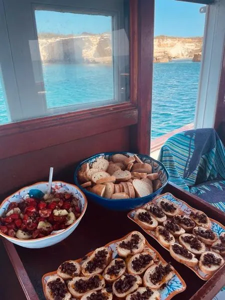 A bordo vengono offerte deliziose bruschette con ciliegino di Pachino insieme a frutta fresca di stagione, vino locale e acqua per garantire una piacevole esperienza culinaria. Viene inoltra fornita l'attrezzatura per praticare snorkeling.